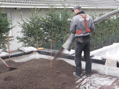 Die Erde wird von einem Pumpwagen auf das vorbereitete Dach gepumpt.